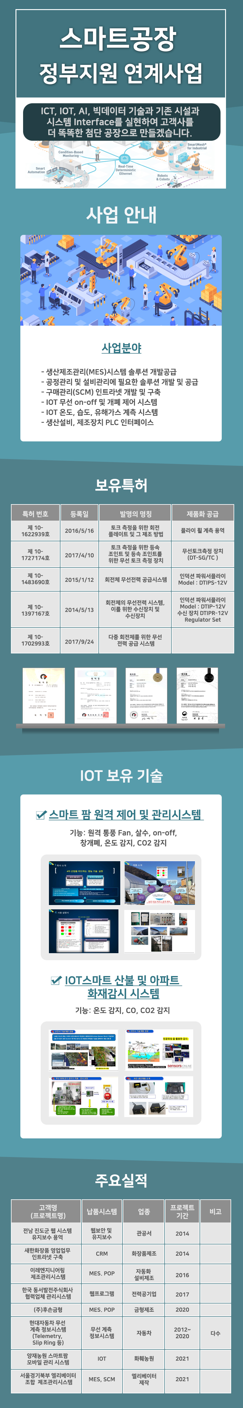 ICT, LOT, AI 빅데이터 기술과 기존 시설과 시스템 interface를 실현하여 고객사를 더 똑똑한 첨단 공장으로 만들고자 합니다